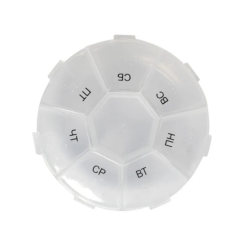Таблетница разделена на семь секций, в каждую из которых Вы можете поместить необходимый Вам набор препаратов.