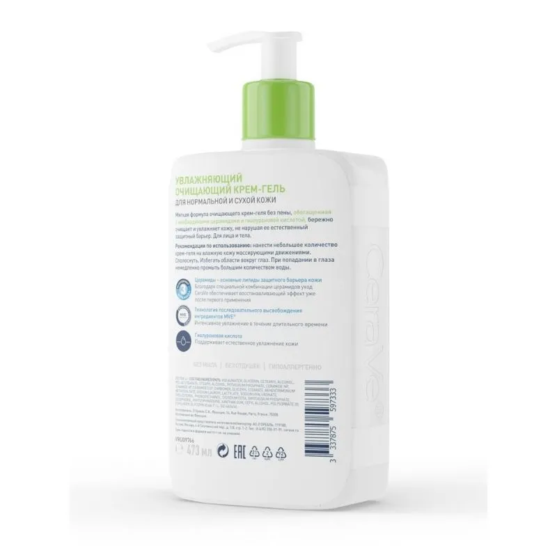 CeraVe Увлажняющий очищающий крем-гель эффективно очищает и увлажняет кожу, не нарушая ее защитный барьер. Не образующий пену крем-гель мягко удаляет грязь, кожное сало и подходит для удаления макияжа. Обеспечивает интенсивное увлажнение кожи уже после первого применения. Подходит для взрослых и детей.
