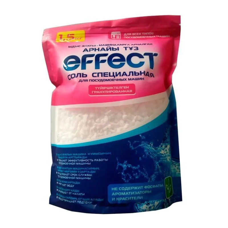 Состоит из очищенной соли и не содержит опасных примесей. Гранулы соли имеют оптимальные для использования в посудомоечных машинах размеры, что обеспечивает необходимую скорость их растворения. Специальная соль подходит для любых типов и марок посудомоечных машин. Она улучает качество мойки, препятствуя осаждению солей кальция и образованию на посуде пятен и подтёков. Защищает внутренние детали посудомоечной машины от образования известкового налёта и накипи, чем продлевает срок её службы.