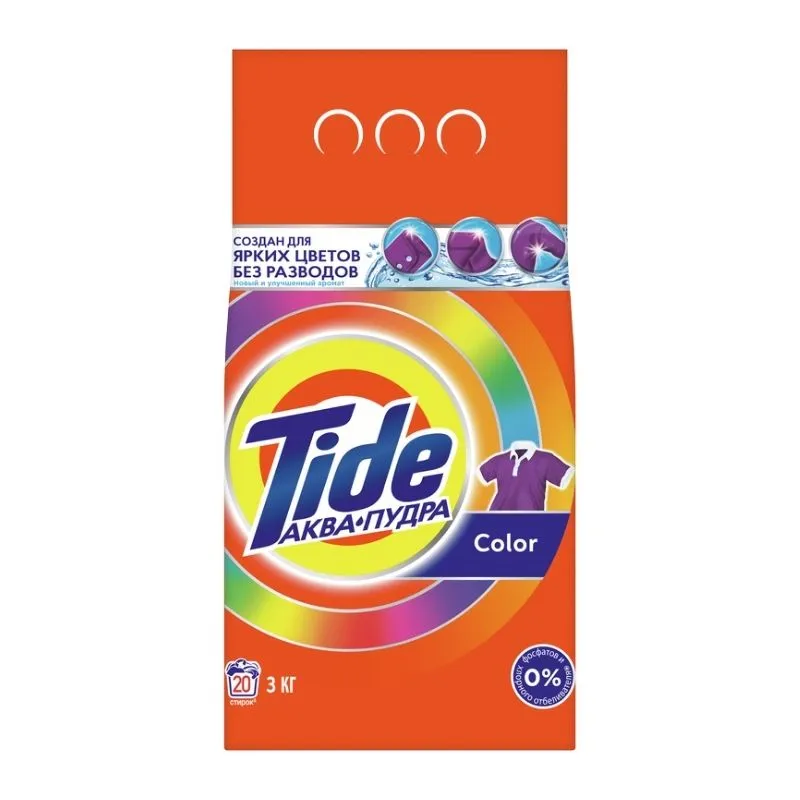 Стиральный порошок автомат Tide Color для стиральной машины предназначен для стирки цветного и белого белья. Tide Color удаляет трудновыводимые пятна и возвращает вещам кристальную чистоту с первой стирки, включая сложные зоны, такие как воротнички, манжеты и область подмышек. Благодаря уникальной технологии Аквапудра, порошок для стирки моментально растворяется при контакте с водой и хорошо выполаскивается. Преимущества Tide Color: • Удаляет сложные пятна и обеспечивает превосходную чистоту; • Сохраняет яркие цвета одежды; • Защищает ткань; • Не оставляет следов на одежде; • 0% фосфатов и хлорных отбеливателей; • Эффективен даже при 30°C. Tide Color также доступен в больших упаковках 9 и 12 кг с более выгодной ценой за стирку. Для максимального удобства стирки – попробуйте капсулы Tide Color.