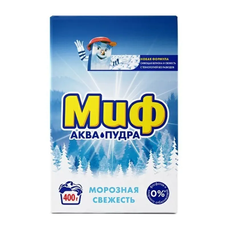 Стиральный порошок Миф Аквапудра Морозая Свежесть — это новая, лучшая формула Миф для сияющей белизны, с технологией против разводов. Стиральный порошок Миф Аквапудра растворяется едва коснувшись воды, и моментально активируется: удаляет даже трудновыводимые пятна и придает одежде сияющую белизну. С помощью технологии против разводов, Миф помогает эффективно справляться с загрязнениями, не оставляя разводов на одежде. Только чистота и морозная свежесть МИФ АКВАПУДРА:- Новый, улучшенный аромат- Сияющая белизна и свежесть