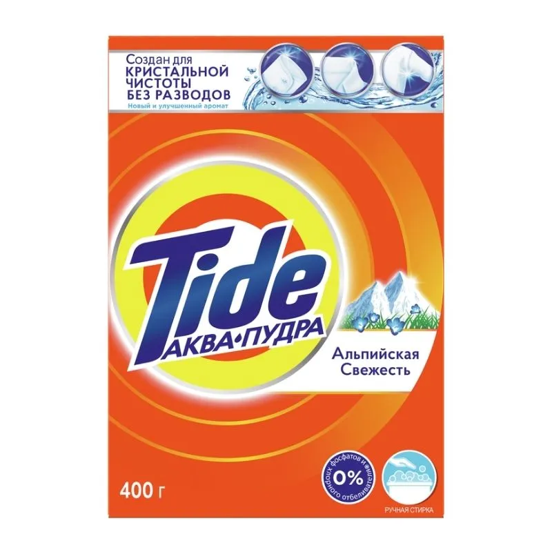 Стиральный порошок ручная стирка Tide Альпийская свежесть предназначен для стирки белого и цветного белья. Tide Альпийская свежесть удаляет трудновыводимые пятна и возвращает вещам кристальную чистоту с первой стирки, включая сложные зоны, такие как воротнички и манжеты. Благодаря уникальной технологии Аквапудра, порошок для стирки моментально растворяется при контакте с водой и хорошо выполаскивается. Преимущества Tide Альпийская свежесть: • Удаляет сложные пятна и обеспечивает превосходную чистоту; • Сохраняет ослепительную белизну вещей; • Защищает ткань; • Не оставляет следов на одежде; • 0% фосфатов и хлорных отбеливателей; • Придает приятный свежий аромат белью; • Эффективен даже при 30°C. Tide Альпийская свежесть также доступен в больших упаковках 6 кг с более выгодной ценой за стирку. Для максимального удобства стирки – попробуйте капсулы Tide Альпийская свежесть.