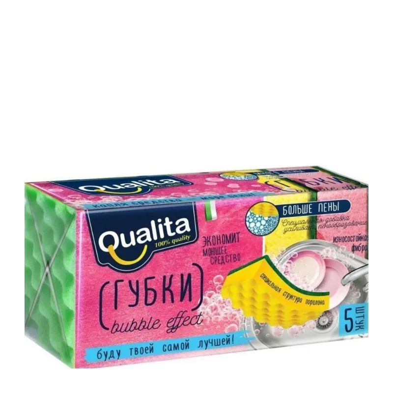 Губки Qualita bubble effect - незаменимый помощник на кухне и при уборке дома и дачи для любой хозяйки. Уникальная структура ячеек поролона препятствует вымыванию моющего средства, что приводит к его экономии. Подходит для хозяйственно-бытовых нужд, мытья посуды, раковин, кафеля и мебели в том числе.