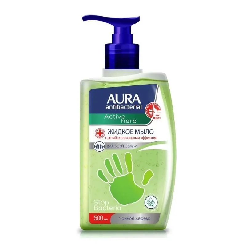 Жидкое мыло с антибактериальным эффектом AURA Antibacterial Active Herb c экстрактом чайного дерева и ионами серебра нежно очищает кожу рук, обеспечивая защиту от бактерий, сохраняя при этом естественный липидный баланс. Жидкое мыло содержит антибактериальный комплекс, в составе которого содержится: - Ионы серебра обеспечивают усиленную защиту, оказывая противомикробное и бактерицидное действие. - Экстракт чайного дерева обладает антисептическими свойствами. Способствует повышению эластичности и упругости кожи. - Urea эффективно увлажняет кожу, улучшая ее состояние. Снимает раздражение и успокаивает кожу. Дарит рукам приятный и свежий аромат зеленого чая. Мыло клинически и микробиологически протестировано. Продукция поддерживается Российским Красным Крестом. Подходит для ежедневного использования всеми членами семьи.