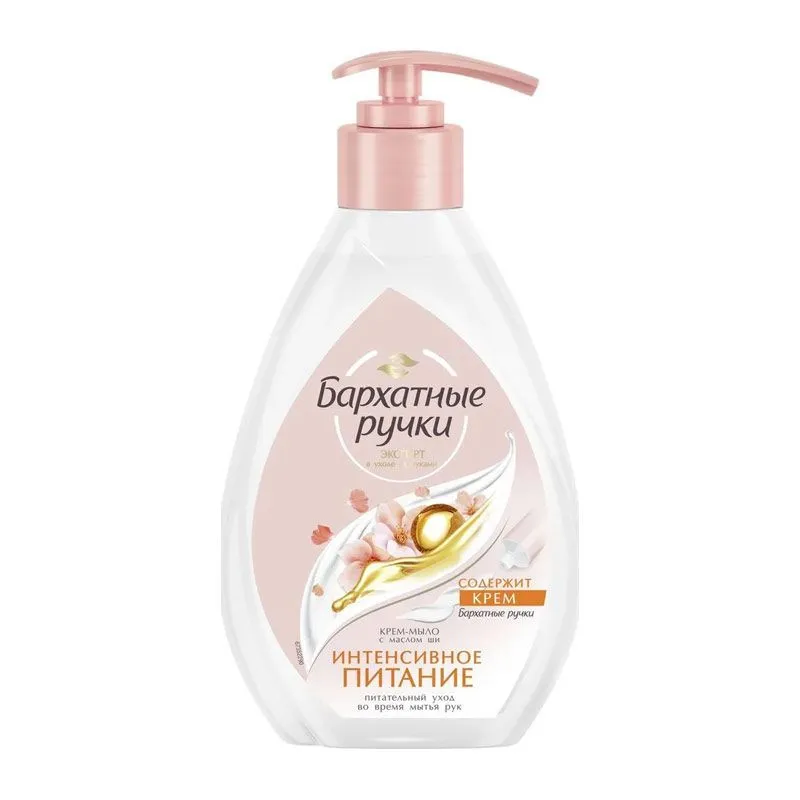Бренд Бархатные Ручки представляет крем-мыло для рук Интенсивное питание, с которым мытье рук превратится в косметическую процедуру по уходу. Крем-мыло содержит крем Бархатные Ручки, за счет чего обеспечивает нежное очищение и питание кожи во время мытья рук. Мыло удаляет бактерии, успешно смывая их с поверхности кожи вместе с другими ежедневными загрязнениями. Не содержит красителей. Соответствует естественному уровню pH кожи.