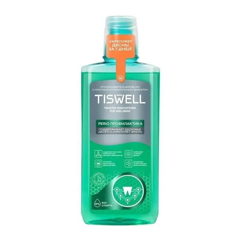 Ополаскиватель для десен Tiswell — это специальное эффективное средство с противовоспалительным эффектом. Ополаскиватель для полости рта с троксерутином и фтором разработан с применением новейшей** технологии клеточной защиты десен PERIO ПРОФИЛАКТИКА. «Полоскатель» для рта от кариеса зубов снижает воспаление десен до 84%°. Жидкость для полоскания рта Tiswell с противовоспалительным комплексом укрепляет десны за 7 дней°. Ополаскиватель для зубов Tiswell с троксерутином и фтором поддерживает здоровье десен и укрепляет эмаль.