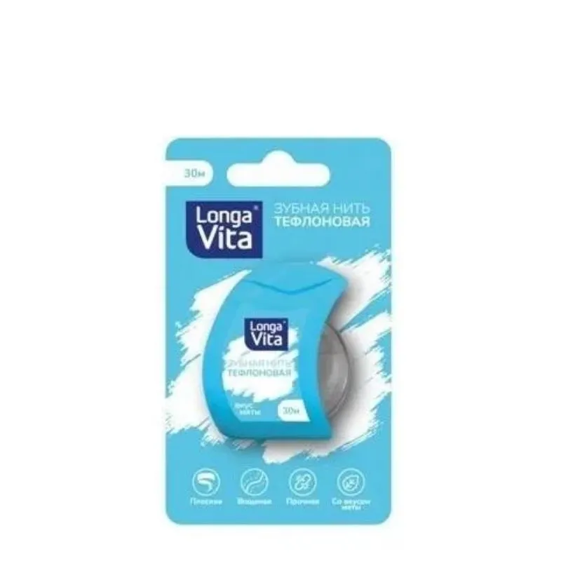 Зубная нить Longa Vita, арт. DF-03, тефлоновая (PTFE). Со вкусом мяты. 30 м. Предназначена для очищения межзубного пространства от налета и остатков пищи. Безопасна для десен. - Крепкая. Изготовлена из высокопрочного полимерного материала на основе тефлона. - Прочная. Не распадается на волокна. - Плоская. Очищает самые узкие межзубные промежутки. - Вощеная. Легко скользит между зубами. - Освежающая. Пропитана ментолом. Материал: Teflon, Microcrystalline Wax, Mint oil;