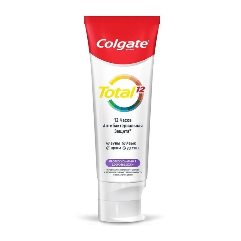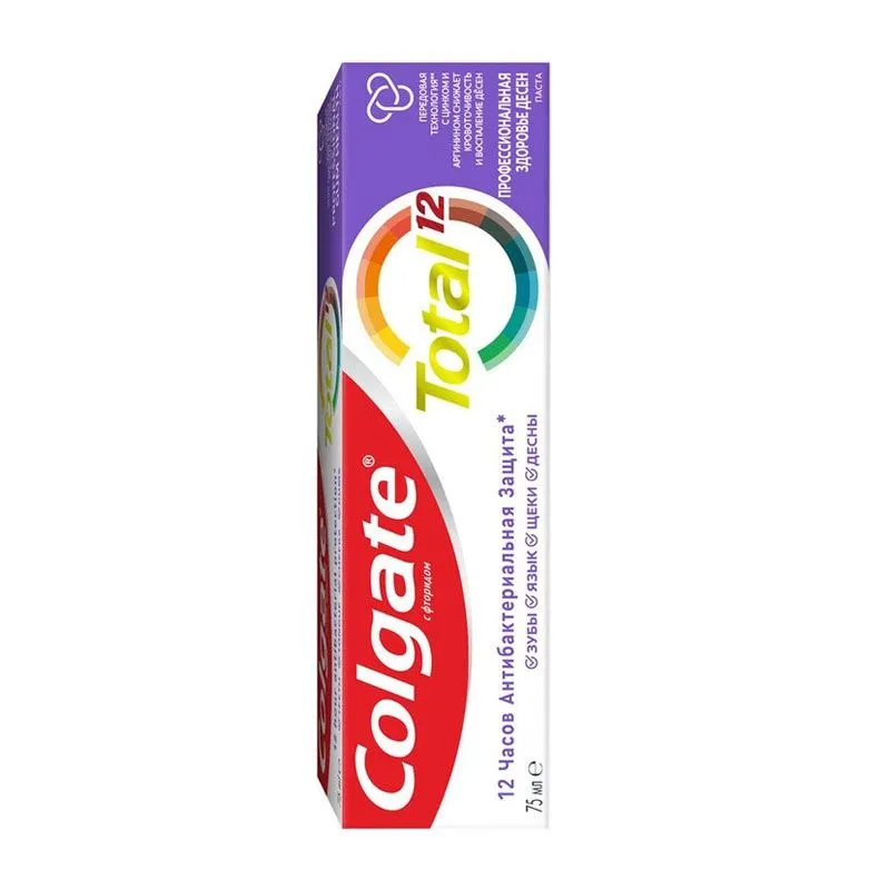 Colgate Total 12 содержит передовую формулу со специальным ингредиентом, который используется стоматологами для гладких и блестящих зубов надолго. Для того, чтобы быть уверенным в своей яркой улыбке, начните со здоровья всей полости рта. Теперь Colgate Total не только борется с бактериями на зубах, но и на языке, щеках и деснах и защищает их в течение 12 часов* Почувствуйте разницу с уверенной, яркой и здоровой улыбкой!