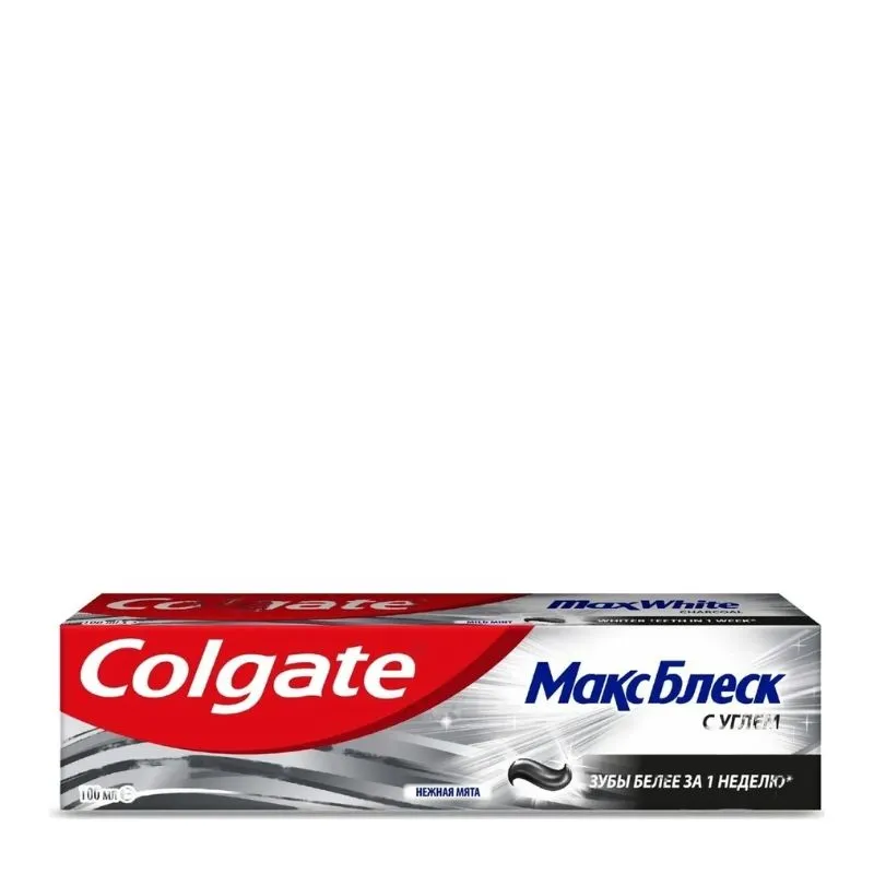 Паста зубная Colgate Макс Блеск с Углем – отбеливающая паста с активированным углем и мятой, которая не только удаляет потемнения на зубах, но и освежает дыхание.Ее гелевая текстура обеспечивает более эффективное очищение зубов и десен, а вкус зеленого чая придает ей особую свежесть.Зубная паста Colgate Макс Блеск с Углем и мятой идеальна для ежедневного использования. Она поможет вам поддержать здоровье полости рта и придаст вашей улыбке максимальный блеск.