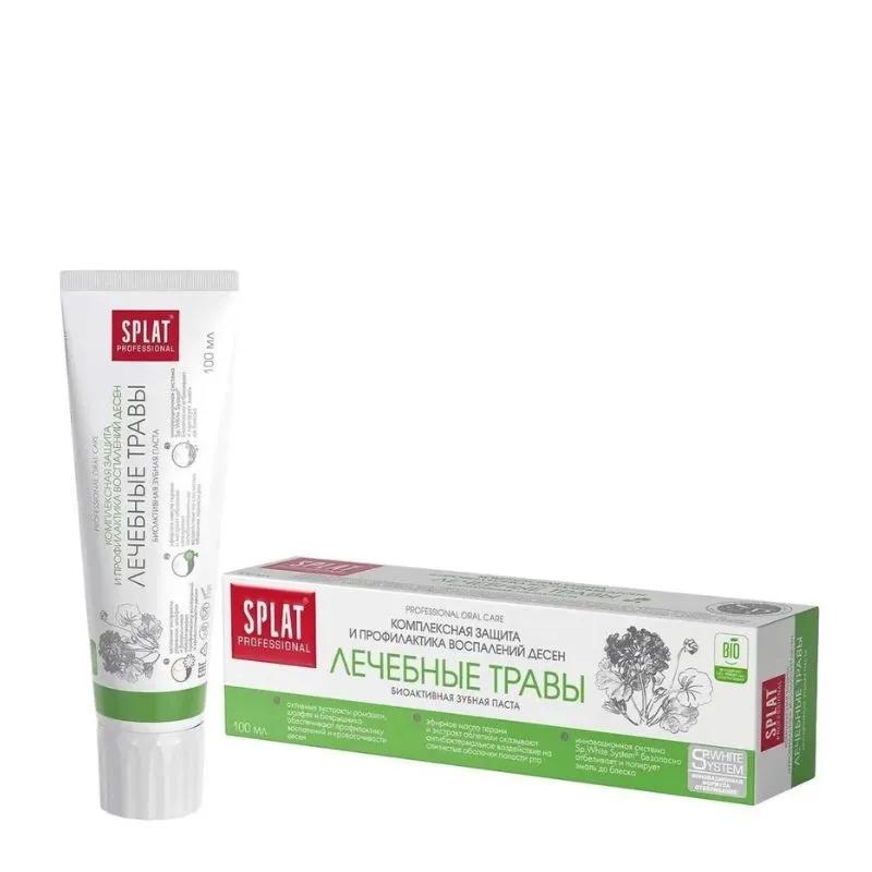 Гелевая зубная паста Splat Professional «Лечебные травы» разработана для комплексного ухода за зубами и чувствительными деснами, снижает их кровоточивость и болезненные ощущения в полости рта. Экстракты ромашки, шалфея и боярышника оказывают антибактериальное и противовоспалительное действие. Эфирное масло герани работает как природный антисептик. Экстракт облепихи способствует быстрому заживлению мягких тканей. Лактат кальция в сочетании фторид-ионами укрепляют эмаль, делают ее устойчивой к воздействию кислот.