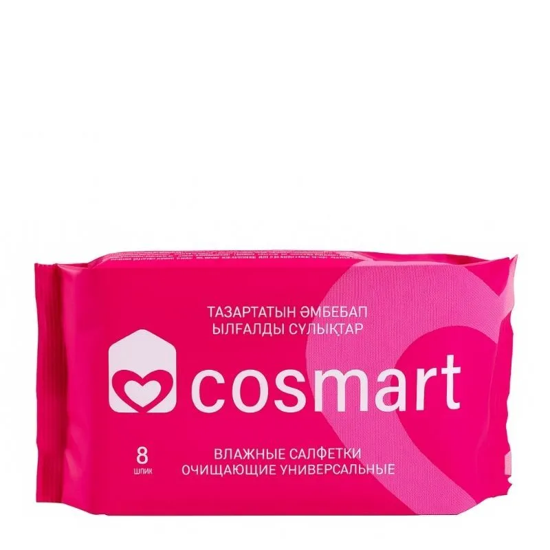 Влажные универсальные салфетки Cosmart, 8 шт — удобный формат для ежедневного использования. Эффективно очищают кожу и поверхности, не оставляют липкости и быстро высыхают. Мягкий материал подходит для чувствительной кожи. Идеальны для дома, поездок и офиса.