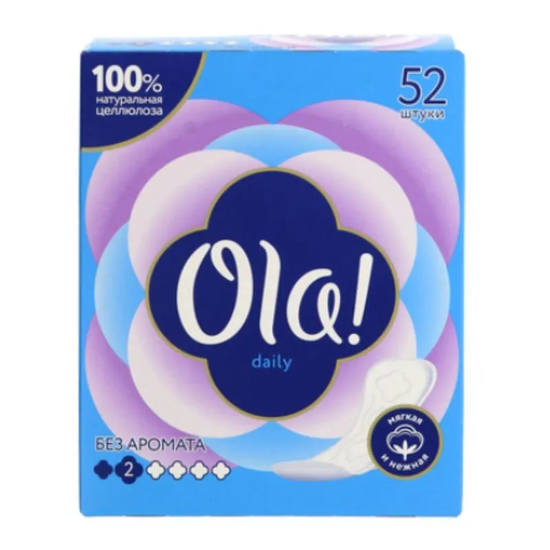 Прокладки ежедневные Ola! Daily гигиенические впитывающие, 52 штук – мягкие и нежные прокладки анатомической формы без крылышек и ароматизаторов. Надежно крепятся к белью и обеспечивают ежедневную защиту и свежесть в течение всего дня.