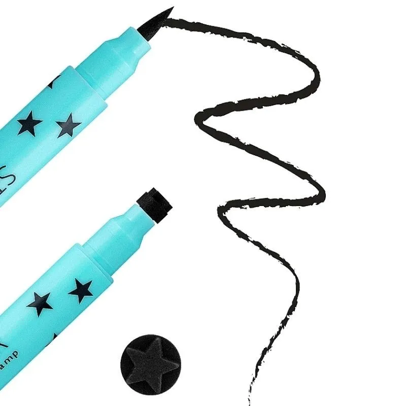 Двусторонний лайнер OhMy Stamp Liner — это подводка с тонким фетровым апликатором для век с одной стороны и штамп для арт-макияжа с другой. Фломастер представлен в 2 вариантах: тату-штампы в виде звездочки и сердечка.