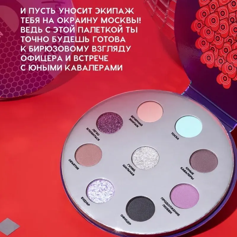 В палетке теней «Танцы Императрицы» есть девять оттенков: нюдовые тона для растушевки, фиолетовые и голубой цвета для трендовых и ярких акцентов в макияже.