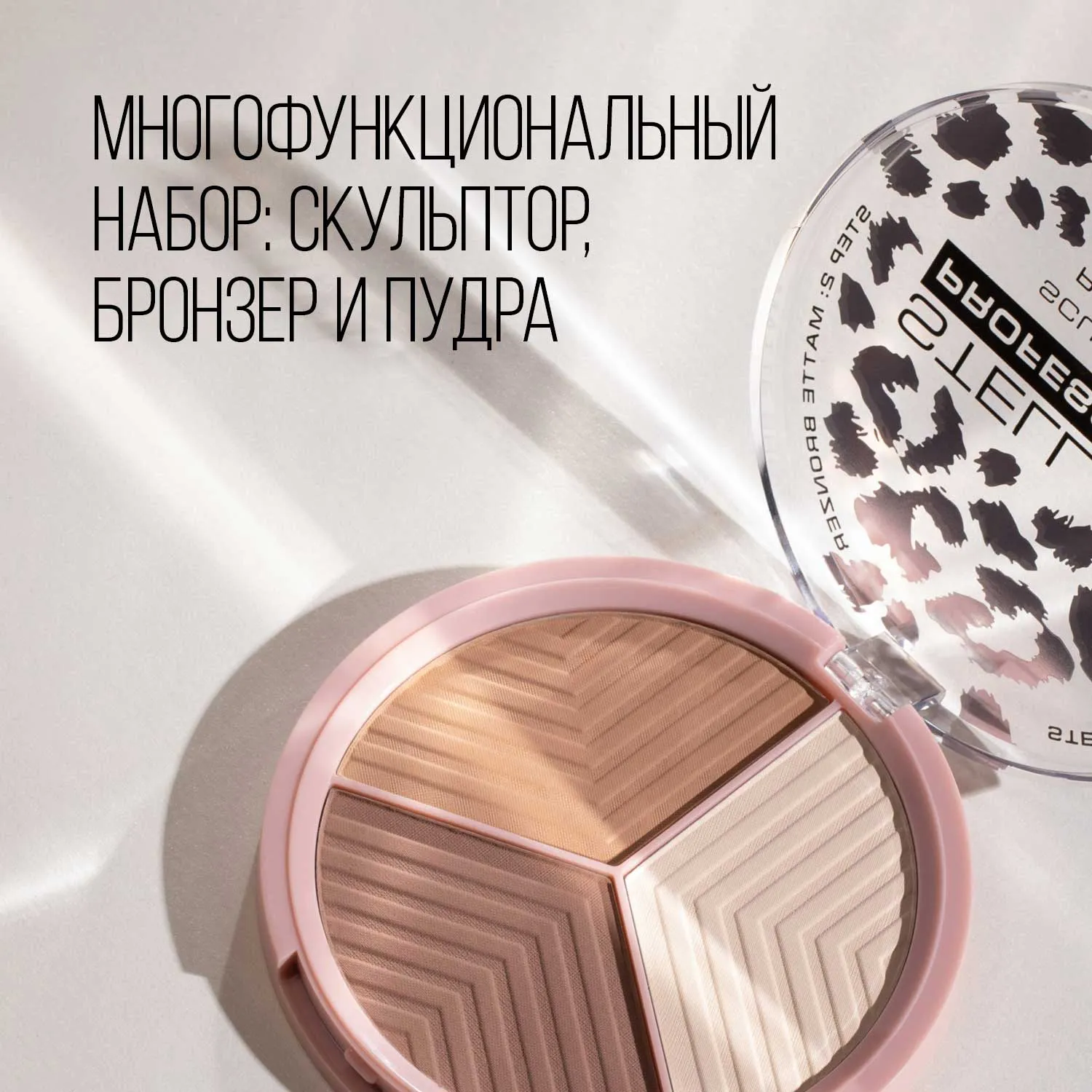 Подчеркните скулы, добавьте сияния и освежите образ всего одной палеткой. Набор 3 в 1 для выразительного макияжа, который захочется повторять каждый день. Скульптор добавит лицу структурности, бронзер создаст эффект загара, а пудра сделает кожу матовой. Все текстуры отлично наносятся, мягко растушевываются, стойко держатся весь день и не сушат кожу. В ассортименте Stellary палетки для лица представлены в двух вариантах: тон 01 с румянами и сияющим хайлайтером для освежающего мейка, тон 02 с бронзером и высветляющей матовой бейкинг-пудрой для гламурного мейка с эффектом загорелой кожи.