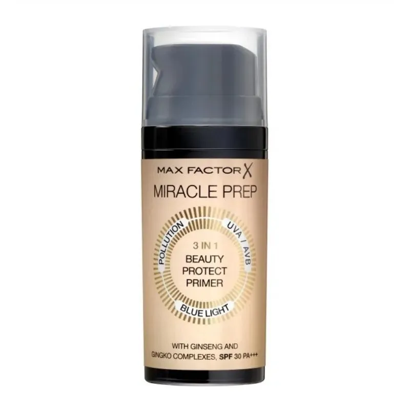 Праймер Max Factor Miracle Prep 3 в 1 Beauty Protect Primer SPF30 PA+++ подготавливает кожу и помогает закрепить тональный крем. Он оснащен технологией, которая помогает сохранить яркий, молодой цвет лица и защитить кожу от 3 ключевых агрессивных факторов окружающей среды: загрязнения, UVA/UVB и синего света. В его состав входит SPF30 PA+++, осветляющий комплекс женьшеня и комплекс Gingko Biloba против загрязнения, поэтому ваш цвет лица выглядит безупречным и красивым. Он не содержит отдушек, масел и силиконов и прошел дерматологические испытания. Подходит для всех типов кожи, включая чувствительную. РЕЗУЛЬТАТЫ (*На основе исследования от 108 до 112 женщин в возрасте от 30 до 55 лет, проживающих в загрязненной зоне): В КОНЦЕ КОНЦОВ: 86% Женщины согласны с тем, что тональный крем не выглядит тусклым из-за городского воздуха/загрязнения.* ПОСЛЕ 28 ДНЕЙ ИСПОЛЬЗОВАНИЯ: 80% женщин согласны с тем, что темные пятна кажутся менее заметными.* 88% женщин согласны с тем, что тон кожи выравнивается.* 92% женщин согласны