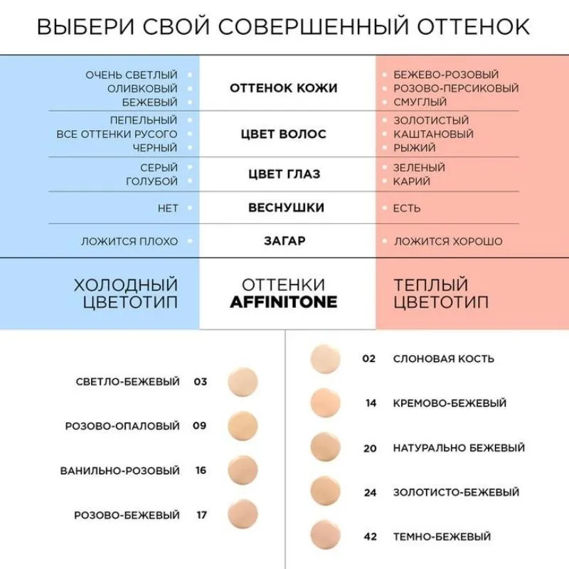 Affinitone Совершенный Тон теперь c гиалуроновой кислотой! Совершенный тон и уход за кожей 24 часа*. Обогащенный минеральными пигментами, тональный крем Affinitone Совершенный Тон подстраивается под тон и текстуру кожи, создавая безупречно ровный тон, без эффекта маски. Ухаживающая формула c гиалуроновой кислотой, витамином Е и аргановым маслом интенсивно увлажняет кожу на весь день. Скрывает несовершенства, тусклость и видимость пор. Заметно улучшает тон и текстуру кожи. Кожа выглядит заметно более свежей, ухоженной целый день. Подходит для всех типов кожи, даже чувствительной. Некомедогенно (не забивает поры).