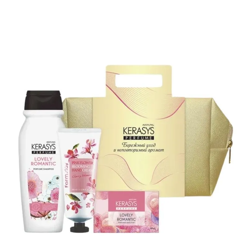 Подарочный набор Kerasys Lovely в косметичке — компактный и стильный набор для ухода за волосами и кожей с нежным ароматом. Идеален для подарка или для использования в поездках.