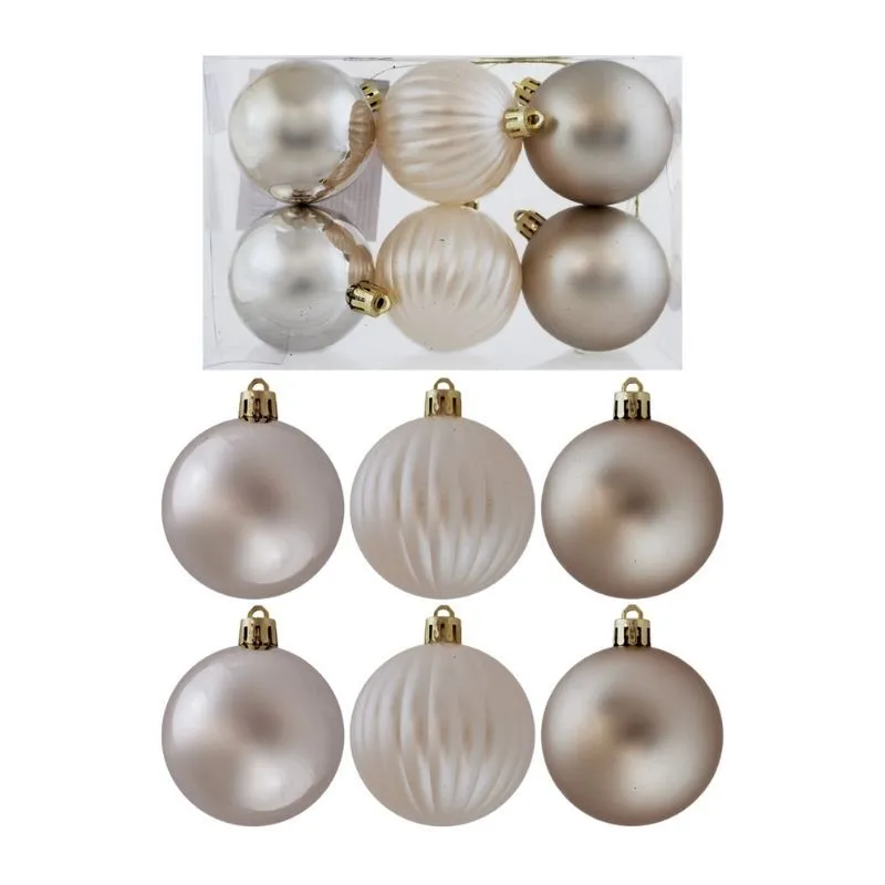 Елочные шары Цвет: шампань+кремовый Количество: 6 шт. Диаметр: 6 см. Материал: пластмасса. Упаковка: пластиковый короб, 17,5*12*6 см.