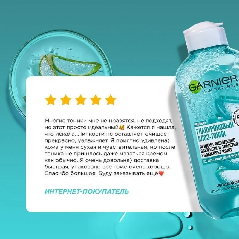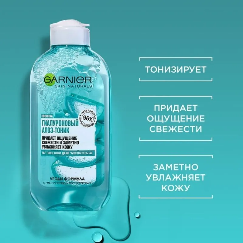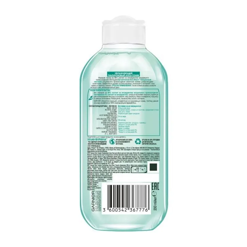 Формула тоника на 96% состоит из ингредиентов натурального происхождения. Обогащена Органическим Алоэ Вера и Гиалуроновой кислотой натурального происхождения известной своими увлажняющими свойствами.
