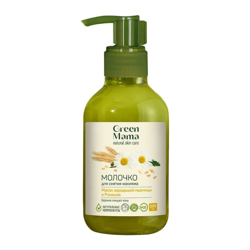 Молочко для снятия макияжа Green Mama c маслом зародышей пшеницы и ромашкой не только эффективно, деликатно удаляет косметику, но и питает, увлажняет и защищает кожу. Подходит для ежедневного применения даже для самой сухой и обезвоженной кожи. Для каждой женщины очень важно, пользуясь декоративной косметикой, быть уверенной в том, что это не повредит её естественной красоте. В состав молочка для демакияжа входят богатые витаминами Е и В5 кунжутное и миндальное масла, масло пшеничных зародышей и экстракт ромашки, которые снимут раздражение, помогут вам сохранить естественный тонус, свежесть и молодость кожи на долгое время. Масло зародышей пшеницы содержит витамин Е и бета-каротин, которые помогают укрепить кожу и сделать ее более упругой. Экстракт ромашки - это естественный антибактериальный и противовоспалительный компонент. Помогает сократить воспалительные процессы на коже, улучшить цвет лица и уменьшить покраснения.