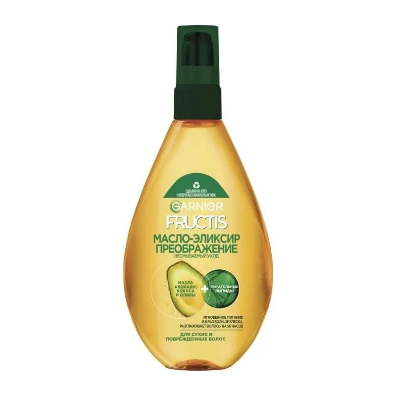 Масло-эликсир линейки Fructis для мгновенного преображения, гладкости и блеска волос. Быстро впитывается без утяжеления, облегчает расчесывание. Формула с триглицеридом, маслами фруктов и ценными растительными экстрактами создает на поверхности волос защитное покрытие, интенсивно питает и повышает их эластичность. После нанесения волосы мягкие на ощупь, гладкие, сияющие здоровьем. Средство подходит всем типам волос и не требует смывания.