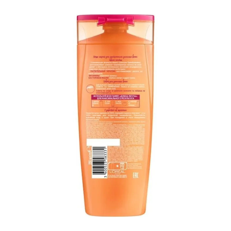 Уникальная формула шампуня обогащена питательным коктейлем, который запечатывает секущиеся кончики и восстанавливает по всей длине: • РАСТИТЕЛЬНЫЙ КЕРАТИН восстанавливает ваши волосы до самых кончиков • ВИТАМИН В5 укрепляет волосы • КАСТОРОВОЕ МАСЛО глубоко питает и дарит блеск