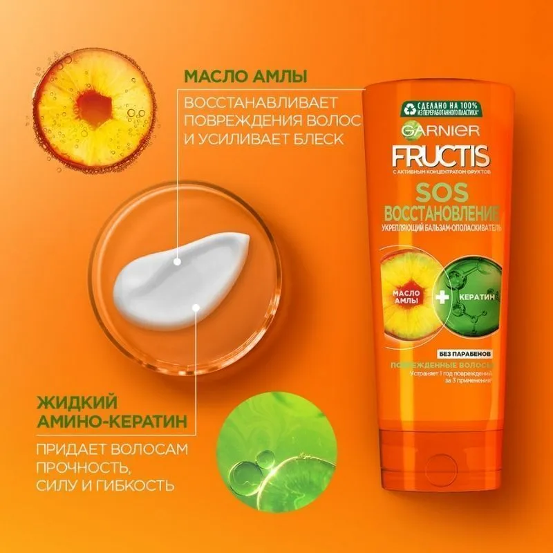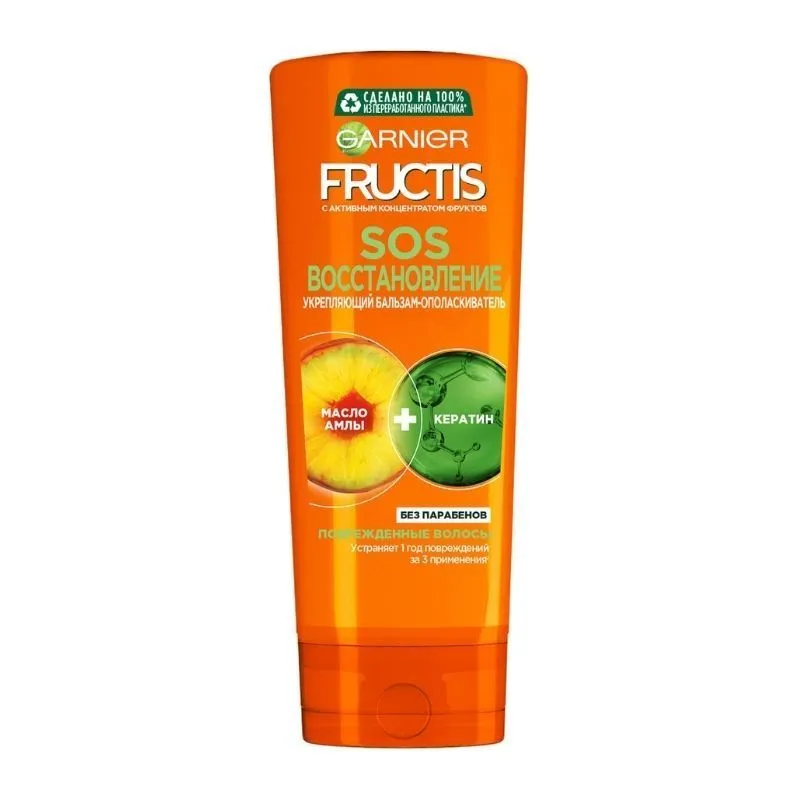 Бальзам-ополаскиватель Garnier Fructis SOS Восстановление укрепляет сильно поврежденные волосы. Устраняет 1 год повреждений поверхности волоса всего за 3 применения*. Средство обеспечивает восстанавливающий, увлажняющий и укрепляющий эффект.