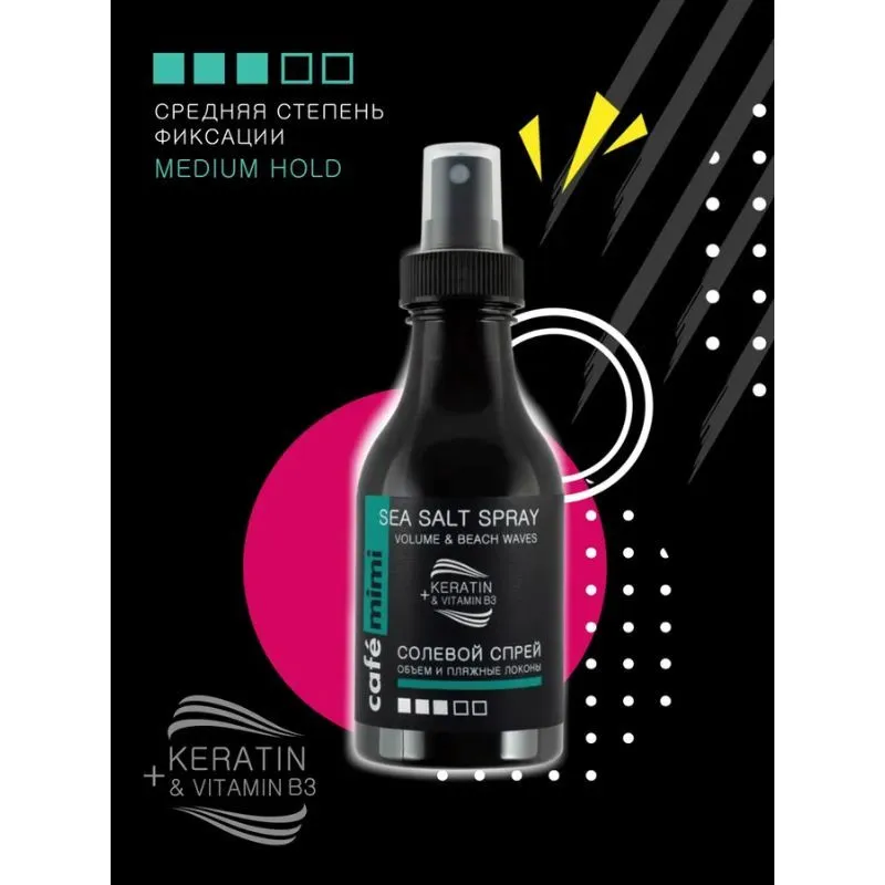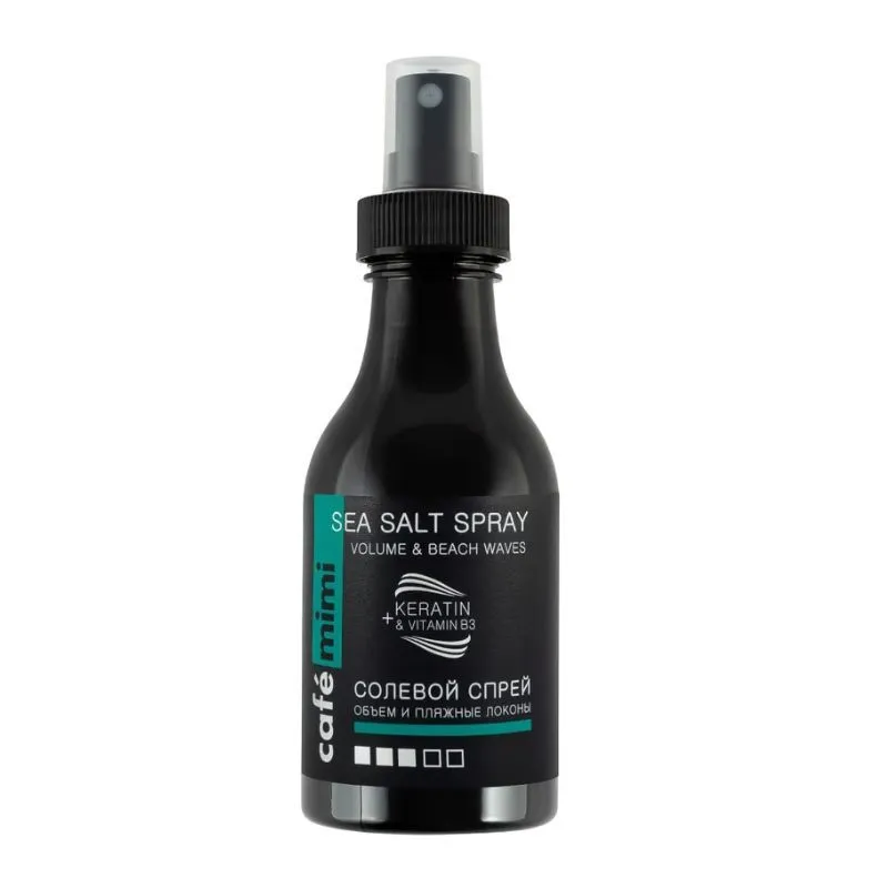 Солевой спрей CAFÉ MIMI с минералами морской соли - идеальное средство для создания непринужденных объемных укладок в «пляжном» стиле. Спрей придает волосам плотность и объем, создает идеальный пляжный образ и обеспечивает легкую надежную фиксацию. Морская соль и кератин оказывают укрепляющее и восстанавливающее действие на структуру волос, придают им жизненную силу и матовый финиш. Экстракт морских водорослей и Витамин B3 питают и увлажняют волосы.