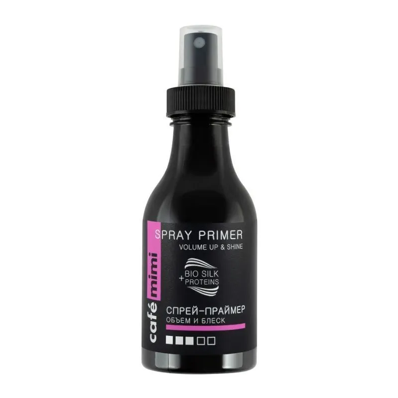 Распылите спрей-праймер на чистые, подсушенные полотенцем волосы с расстояния 20-30 см по всей длине, начните укладку